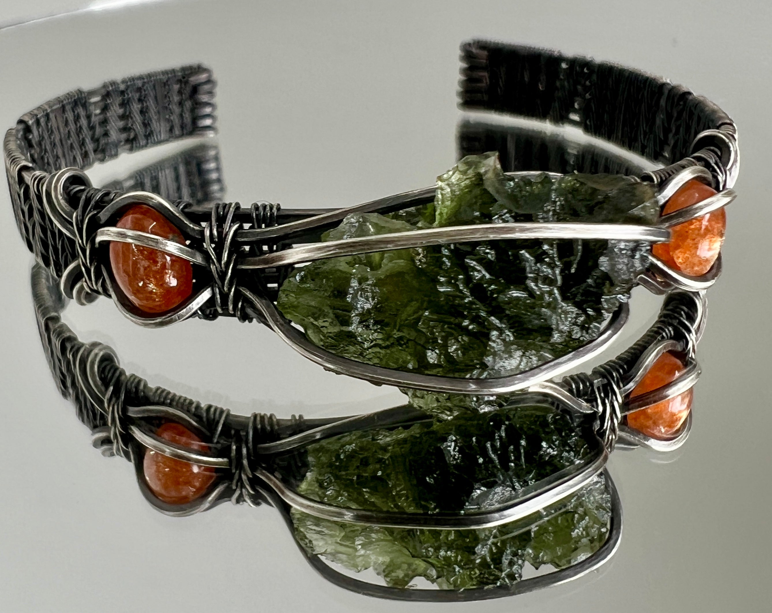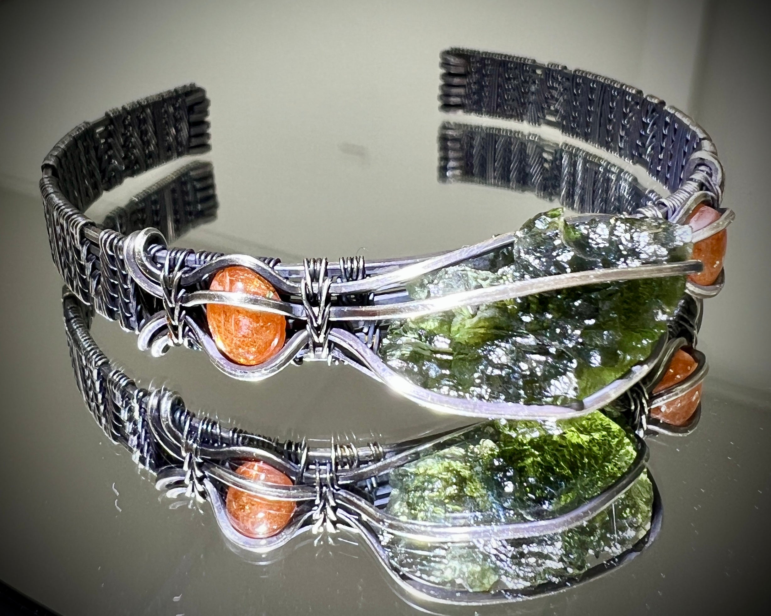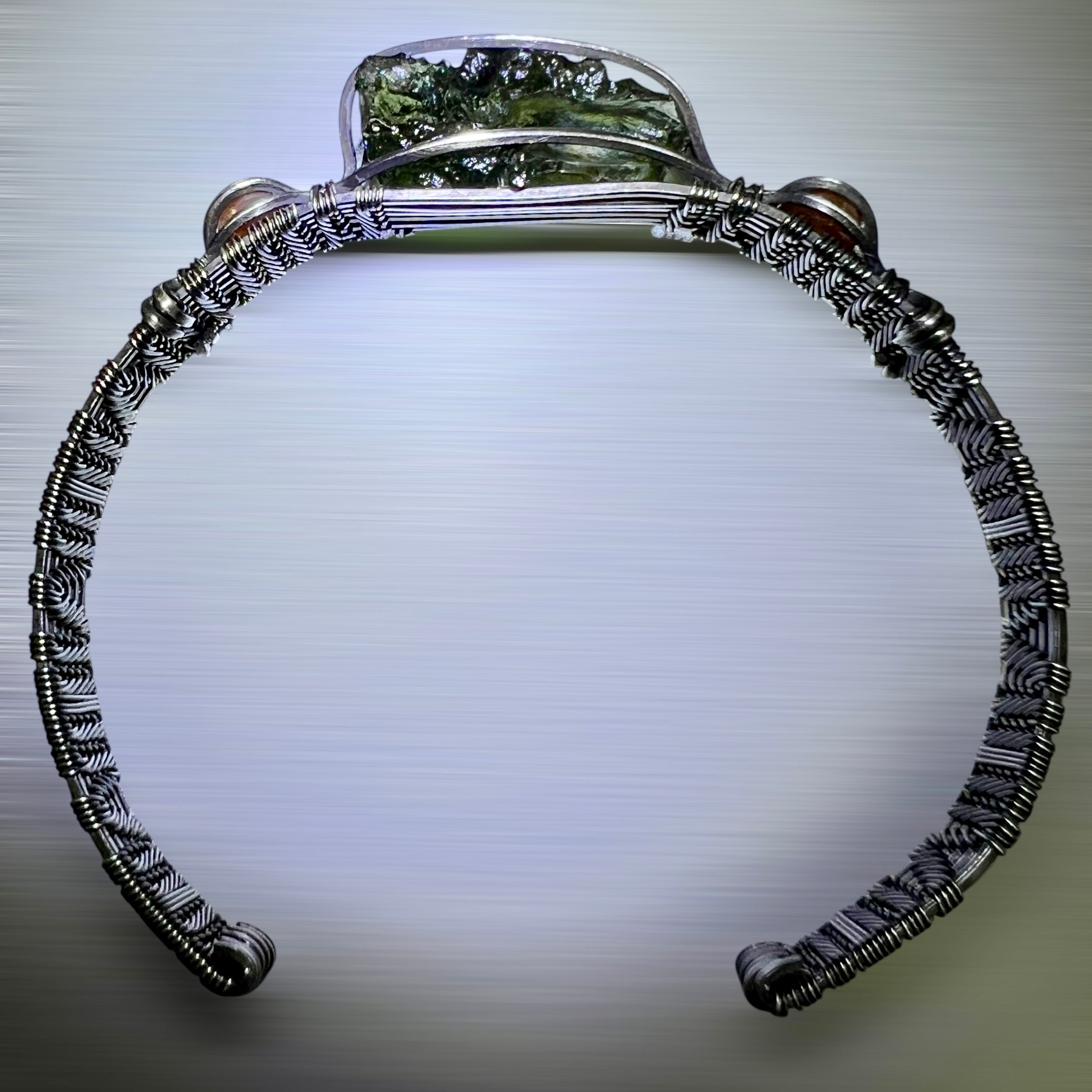 Intricately woven Moldavite bracelet in antiqued sterling silver wire, accented with vibrant Carnelian.