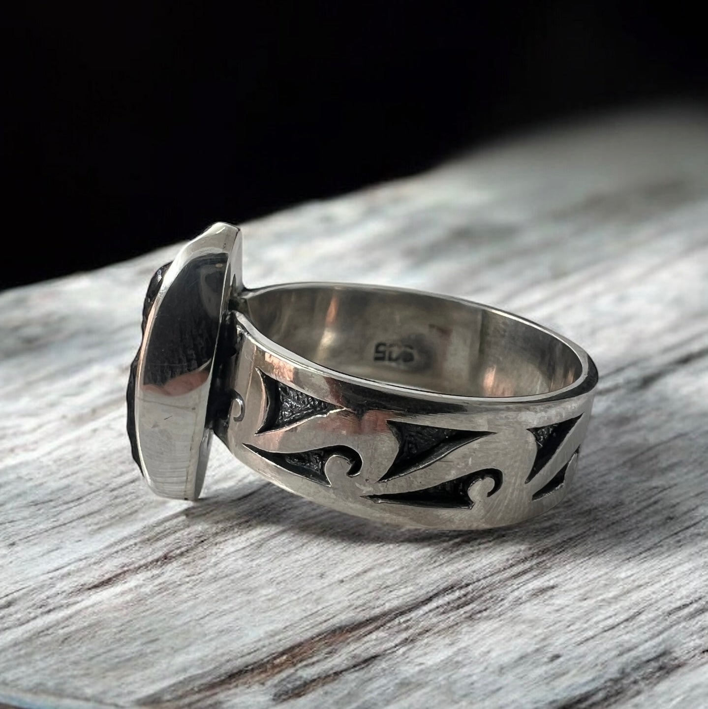 The handcrafted silver band is polished yet substantial, offering both comfort and presence. Its clean inner curve ensures an easy fit, while the detailed engraving adds a touch of celestial artistry.
