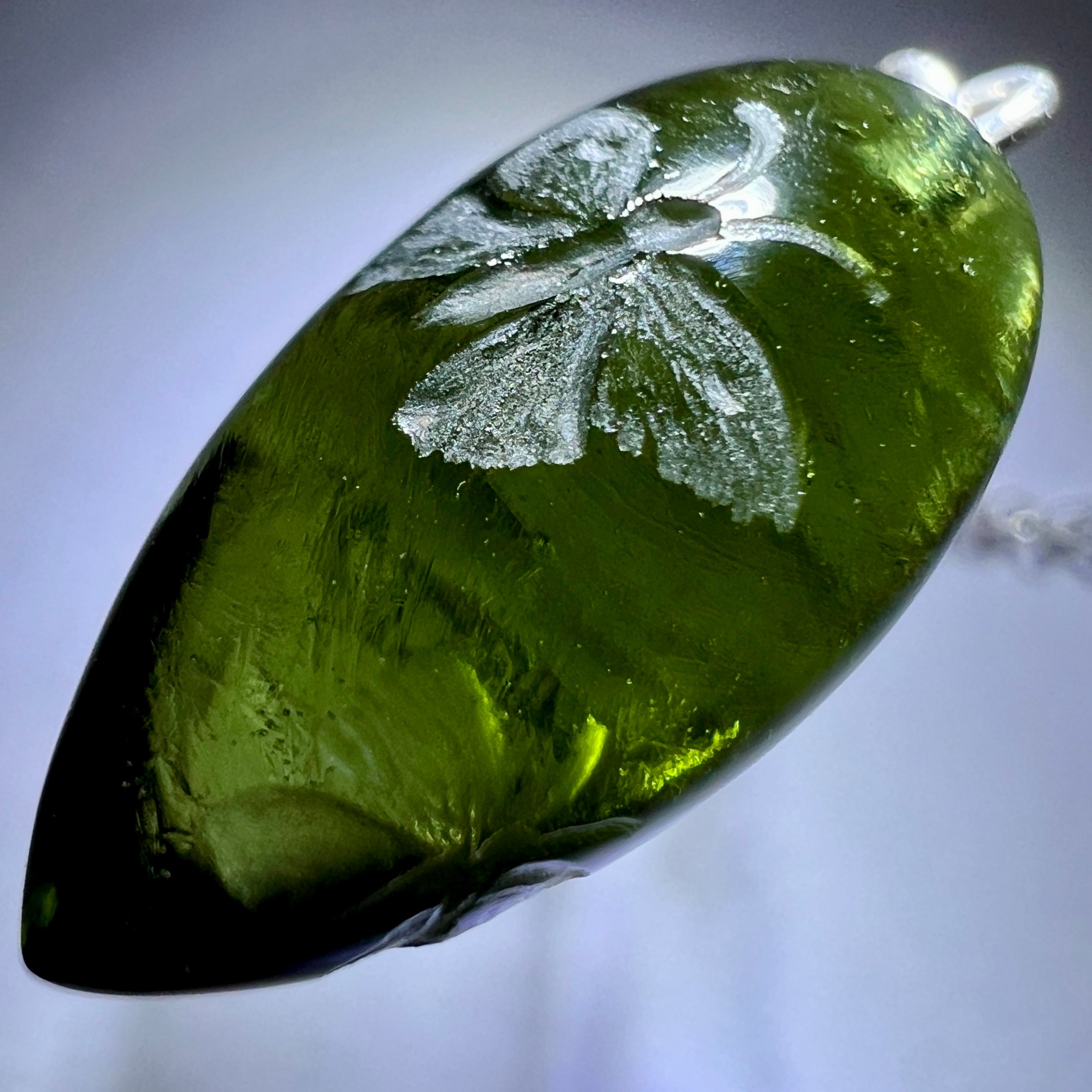 The process is as demanding as it is creative. Not every Moldavite survives the transformation: some pieces rupture under the engraver’s hand due to the natural inner tensions locked within the stone. These stresses date back 15 million years, when the Moldavite was born in a cataclysmic impact—molten matter hurled through the atmosphere, cooling rapidly as it rained back to Earth.