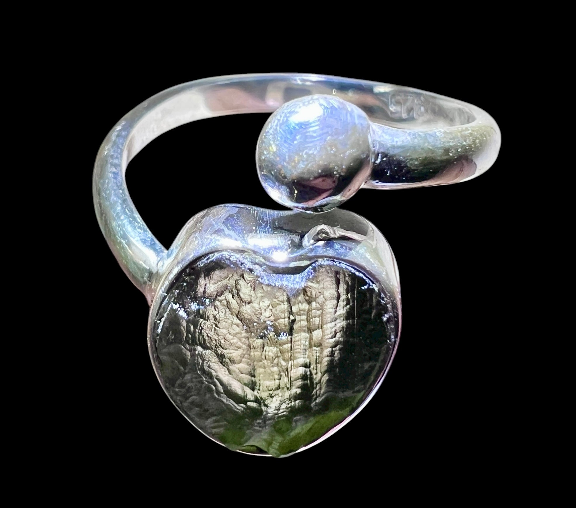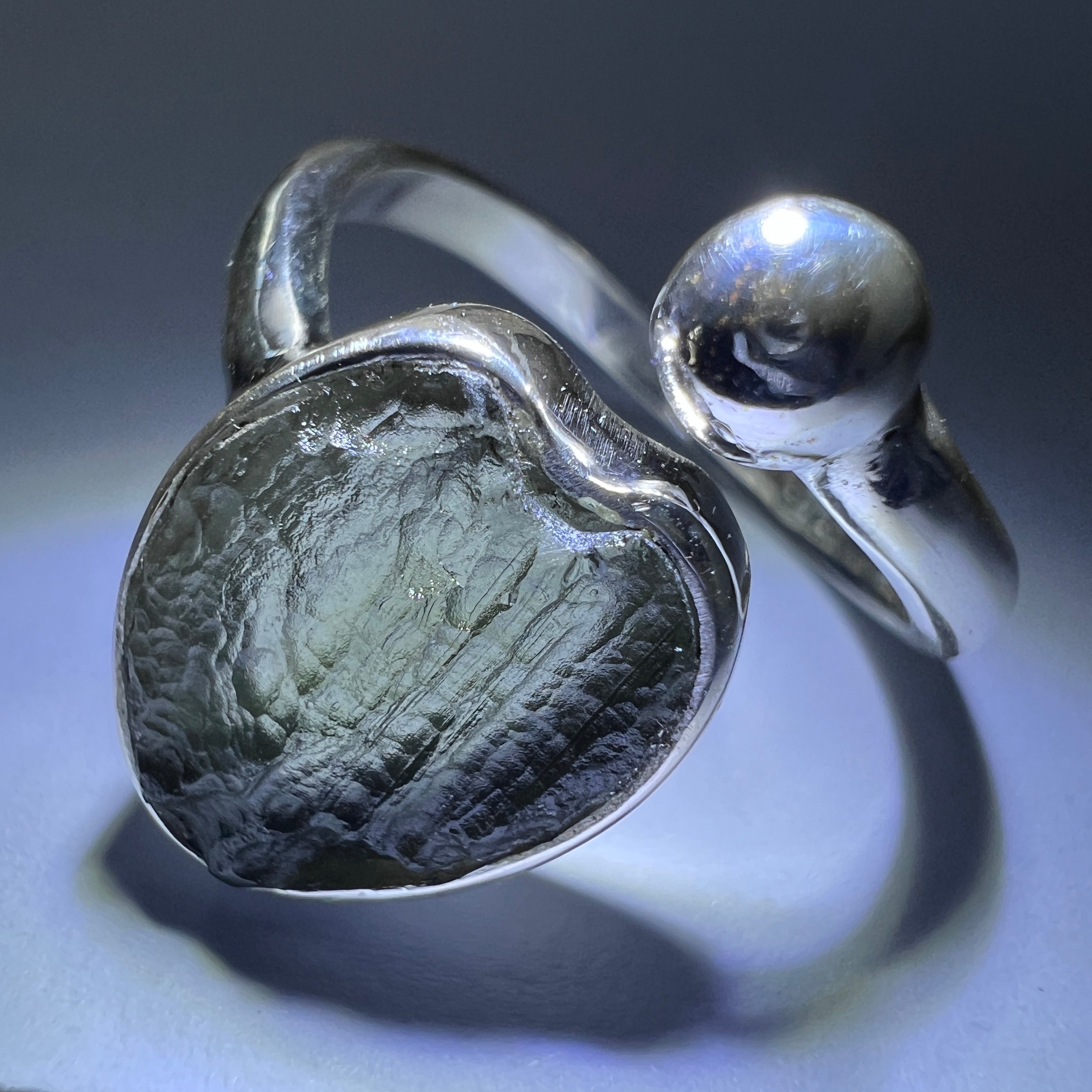 A handcrafted sterling silver ring featuring a round, symmetrical 1.1g genuine Moldavite from the Chlum locality in the Czech Republic.