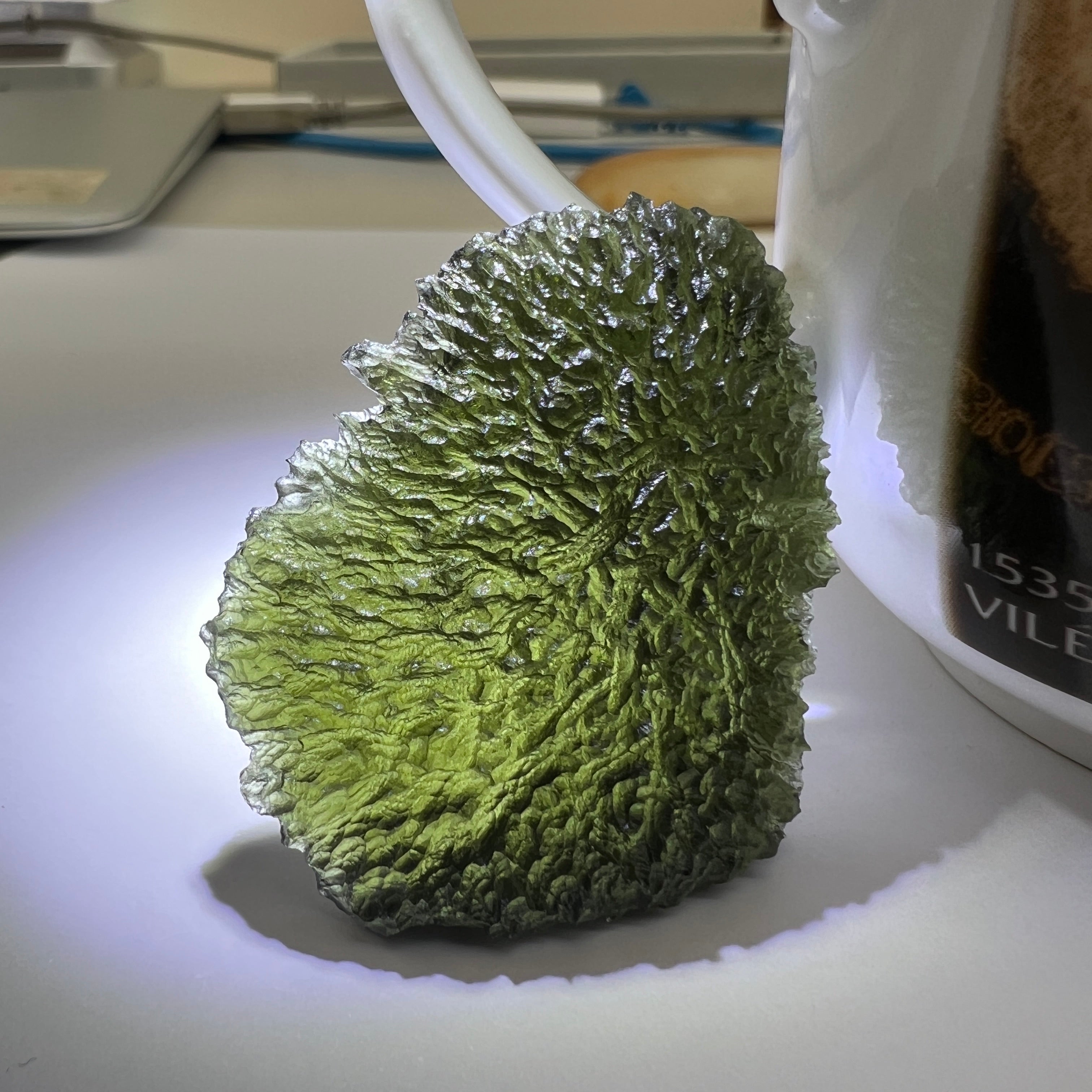 Moldavite is a rare tektite or meteoric glass, caused by an asteroid impact 15mil. years ago. The intense, 10,000°c+ temperatures of the strike vapourised the asteroid, target rock and sand, flinging the molten substance high into the atmosphere.