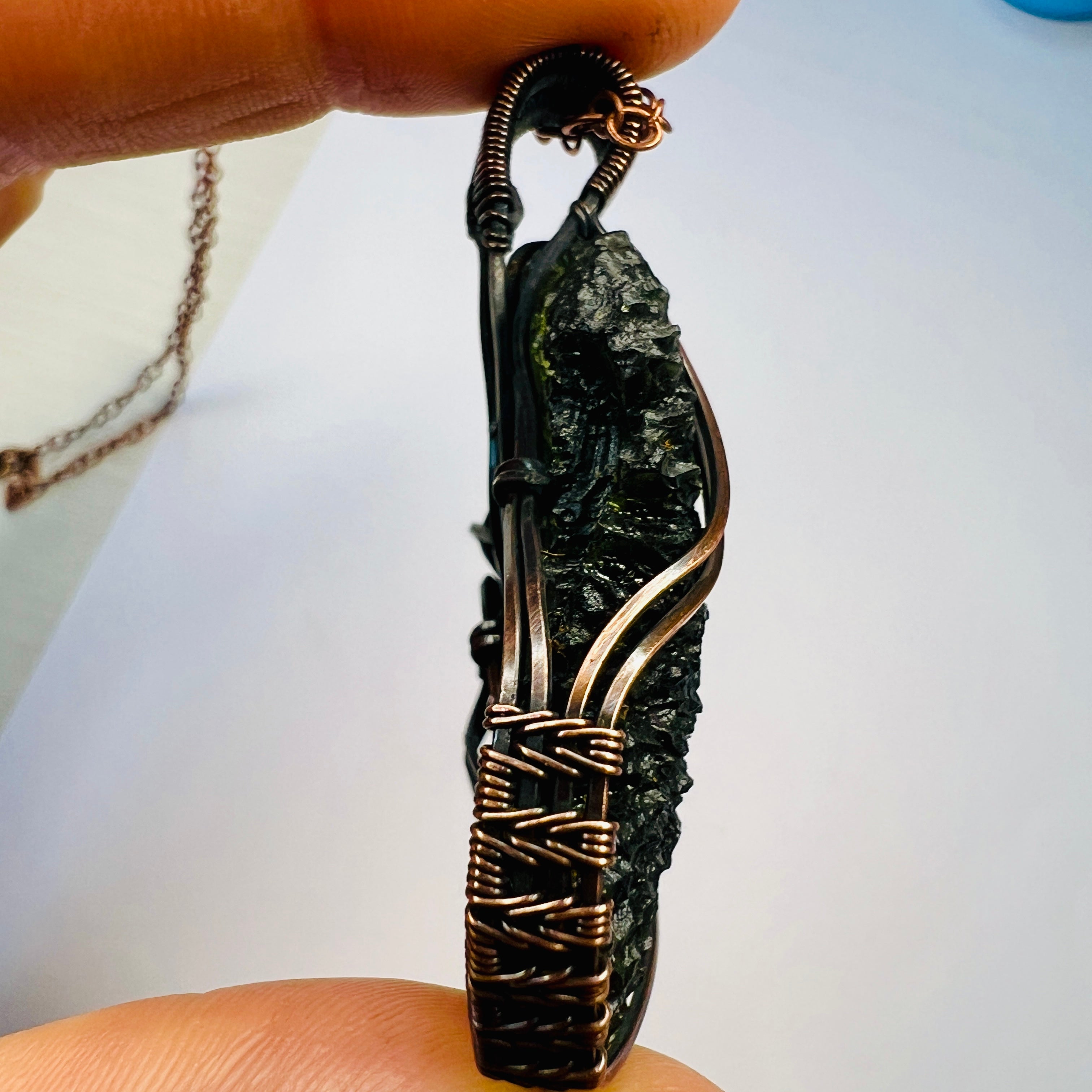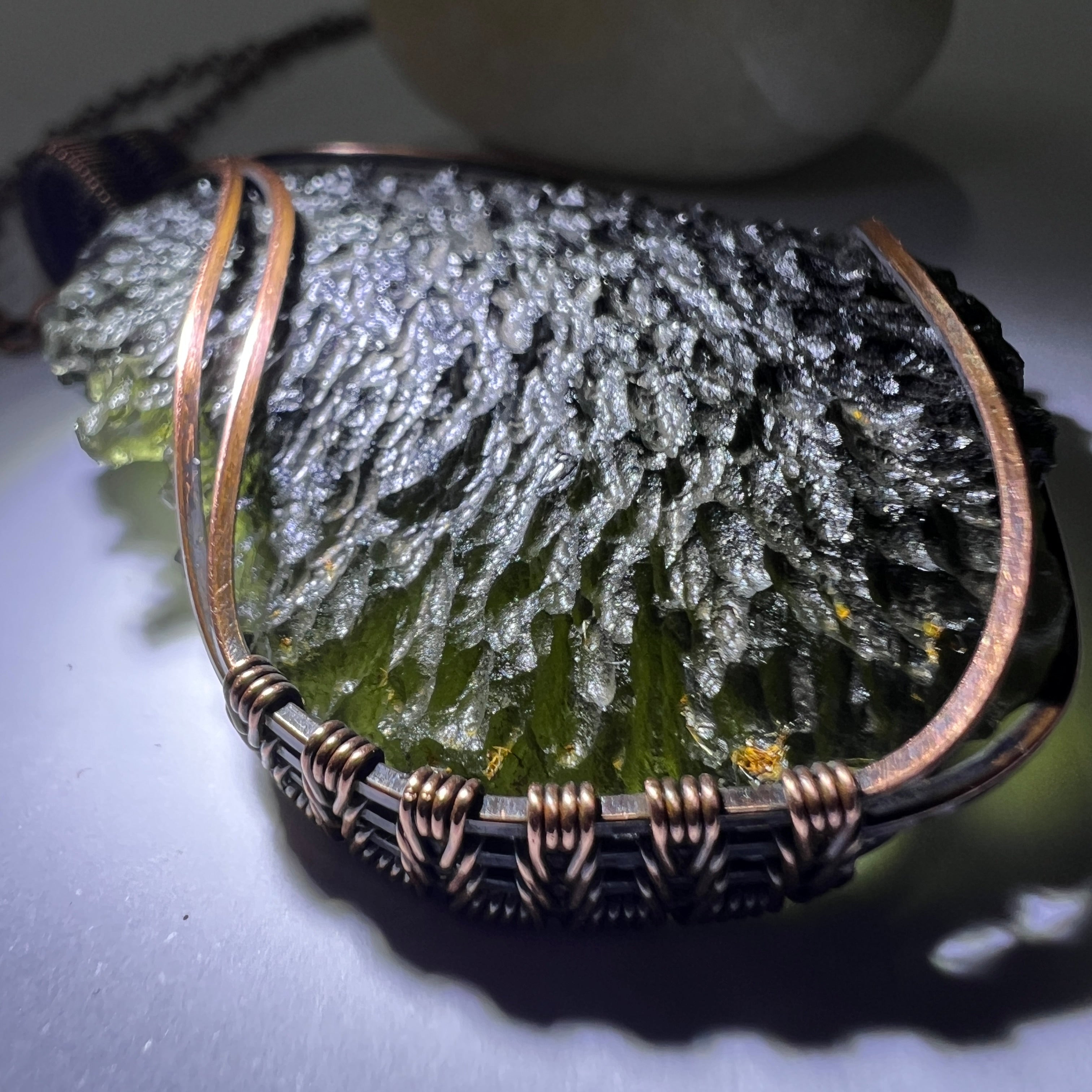 Visually, the rustic glow of antiqued copper harmonizes with Moldavite’s deep forest-green hue, giving the piece a timeless, organic look. Energetically, copper acts as a bridge between the heavens and the earth, mirroring Moldavite’s origin—born from the union of cosmic impact and terrestrial matter. Together, they form a powerful combination: Moldavite for awakening and transformation, and copper for grounding, circulation, and amplification.
