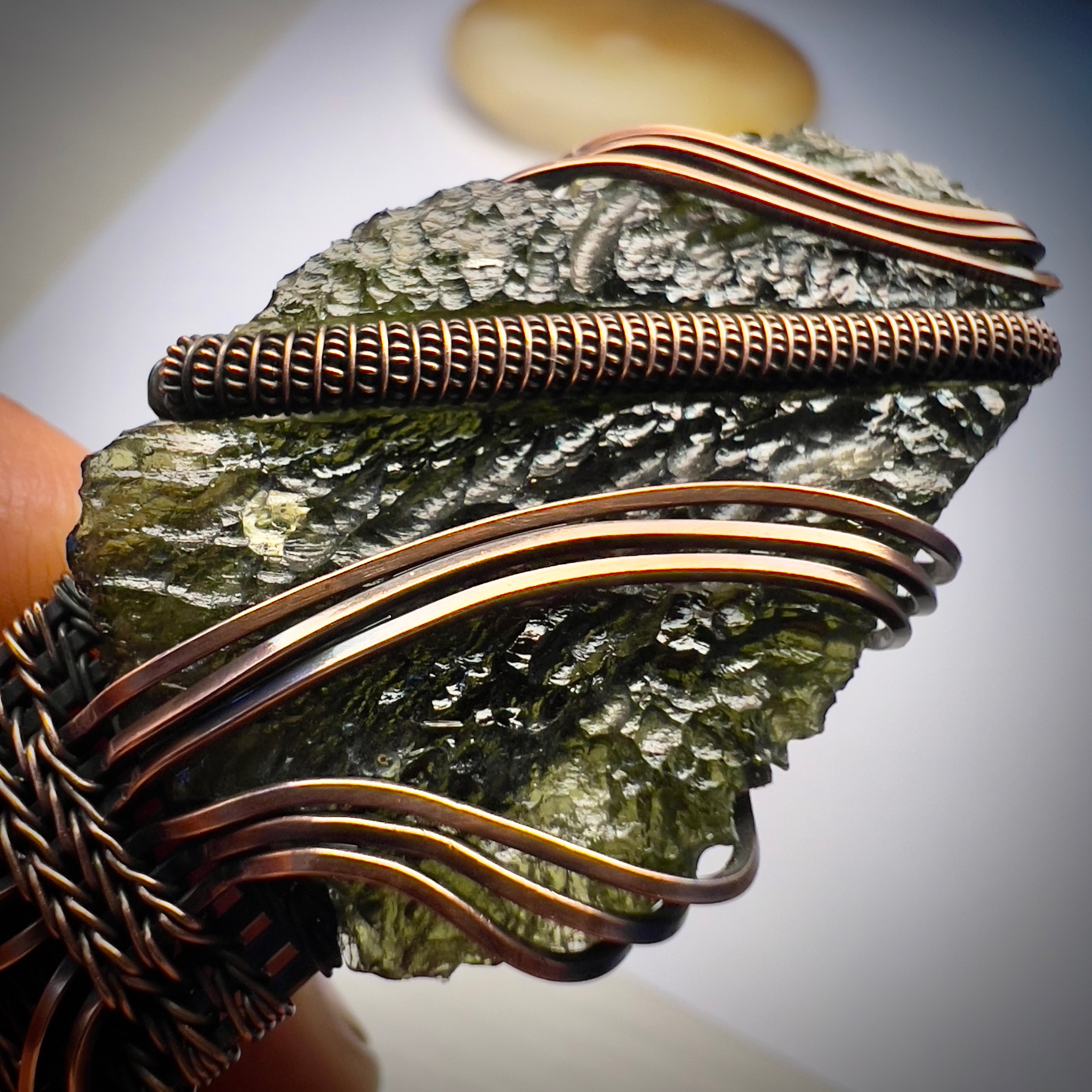 This awe inspiring bracelet features a 7.34g Moldavite specimen from Marouskovo Pole, masterfully woven in antiqued copper. The 15 mm band width, combined with the sizeable, beautifully textured Moldavite, gives this piece a bold, watch-like presence on the wrist.