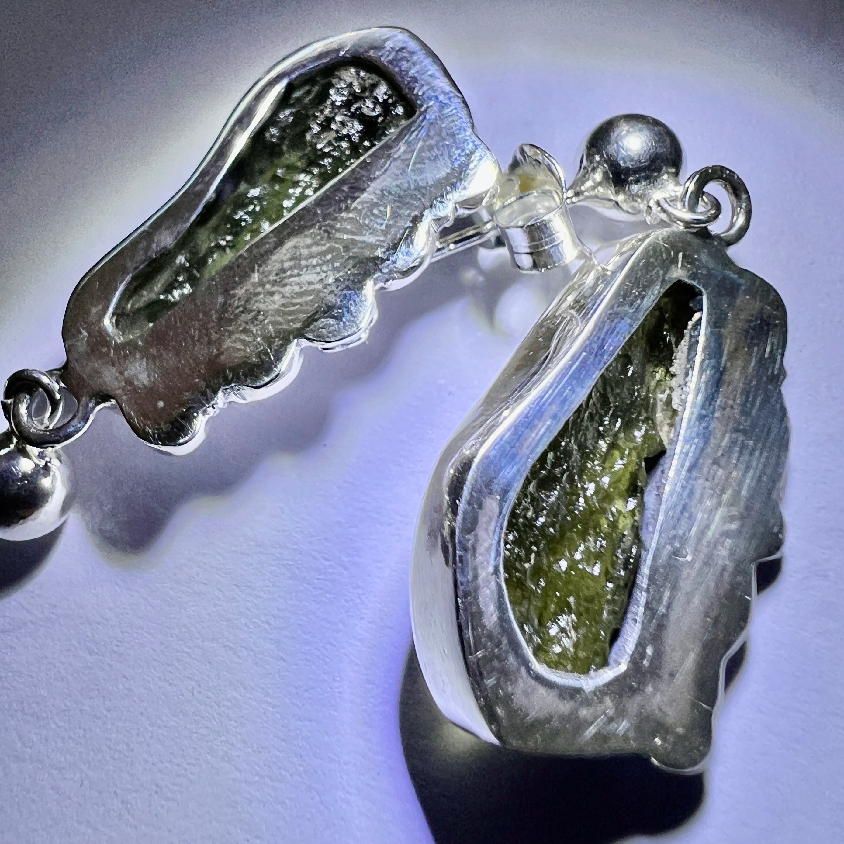 At the center, vivid green Moldavite gemstones from the Chlum locality in the Czech Republic bring a touch of natural energy and depth, contrasting beautifully against the cool brilliance of polished silver.