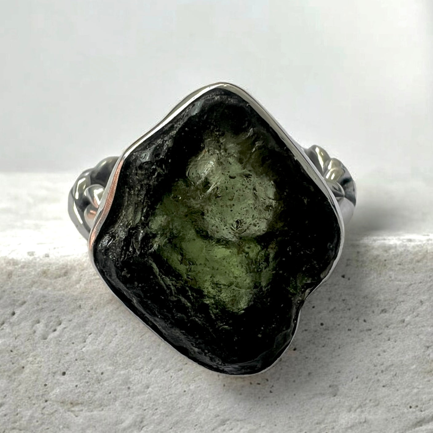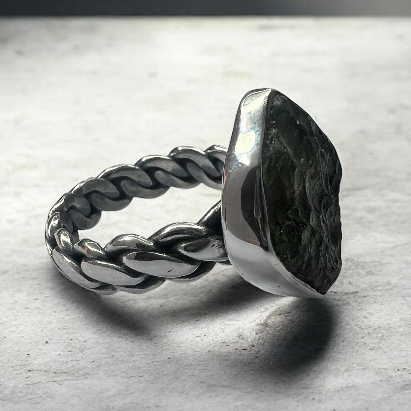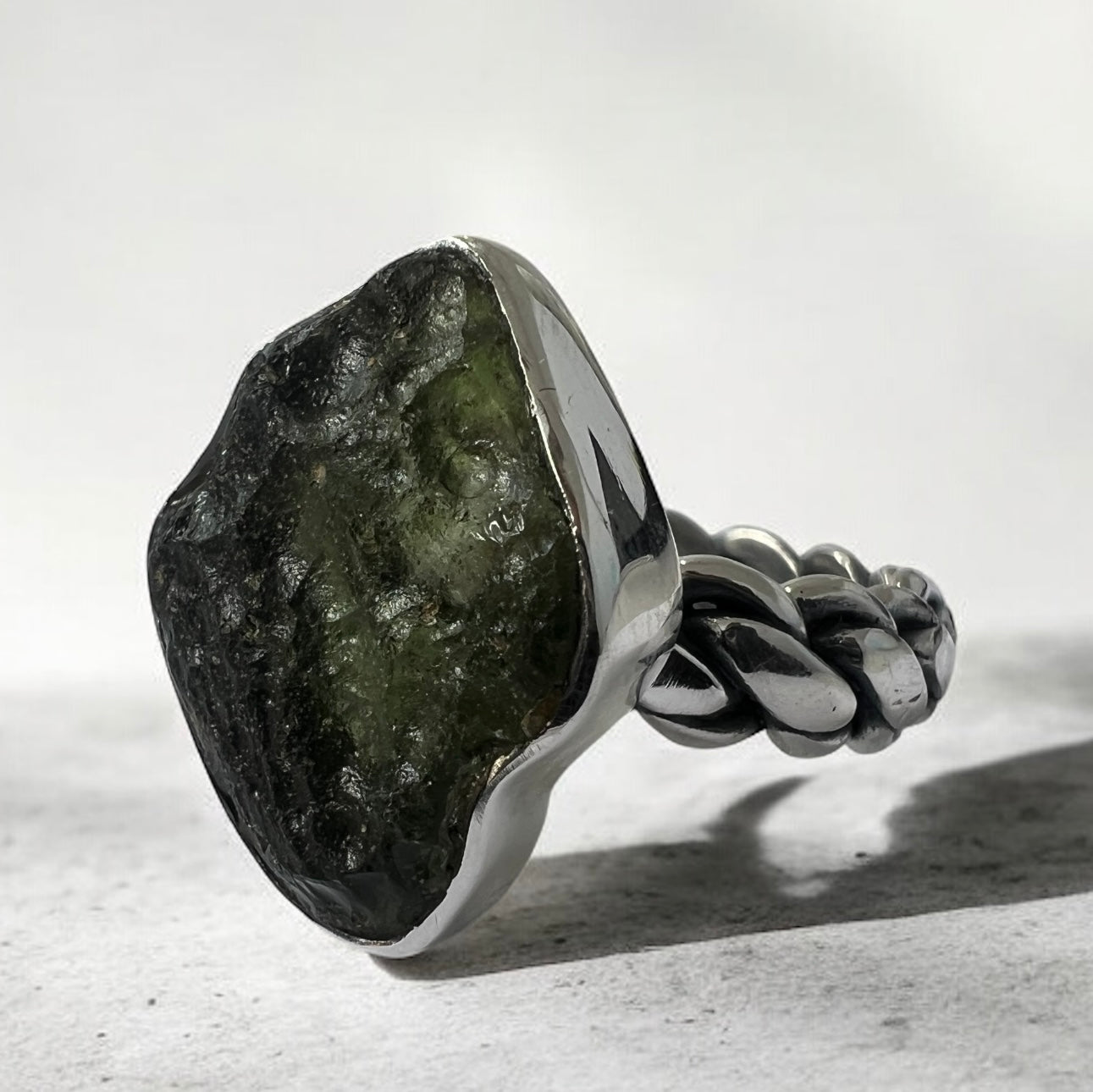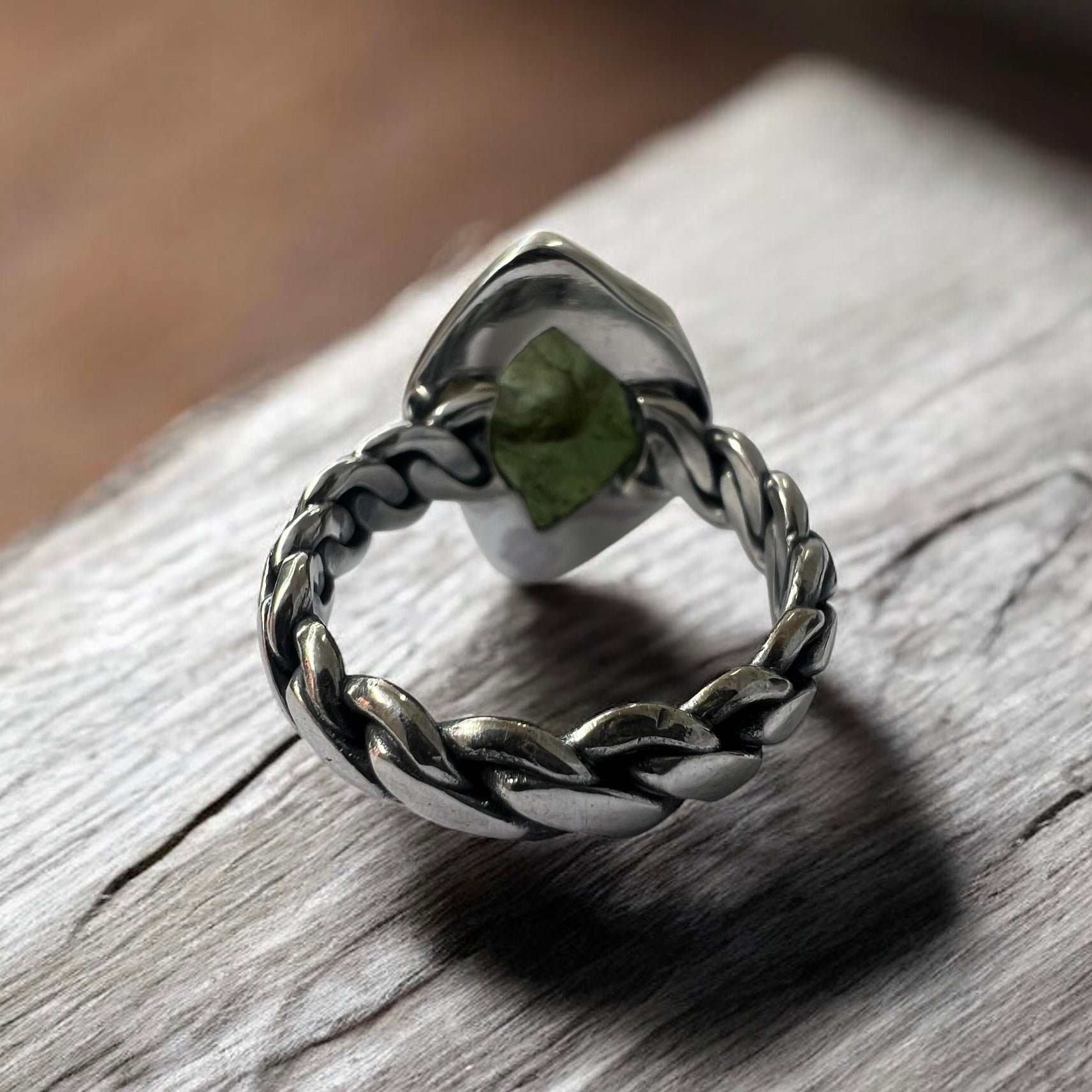 Revered as the Stone of Transformation, Moldavite is said to heighten awareness, open the heart, and connect the wearer to universal energy — making this ring more than adornment, but a personal symbol of cosmic alignment and evolution.